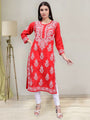 Delineation: Purchase this elegant and comfortable chikan kurti online from Seva, is ideal for any fashionista. It has mutli-coloured rich and attractive chikan embroidery. Buy this classic kurti for any occasion, any festival and any party celebrations.