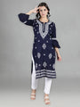 Delineation: Purchase this elegant and comfortable navy blue chikan kurti online from Seva, is ideal for any fashionista. It has white coloured rich and attractive chikan embroidery. Buy this classic kurti for any occasion, any festival and any party celebrations.