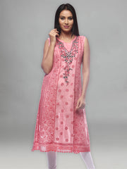 Seva Chikan Hand Embroidered Carrot Pink Cotton Lucknowi Chikan Kurti-SCL0233