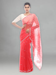 Seva Chikan Hand Embroidered Carrot Pink Cotton Lucknowi Saree-SCL2476