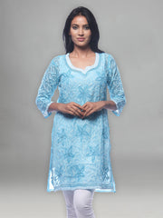 Seva Chikan Hand Embroidered Blue Georgette Lucknowi Chikan Kurti With Slip-SCL0212