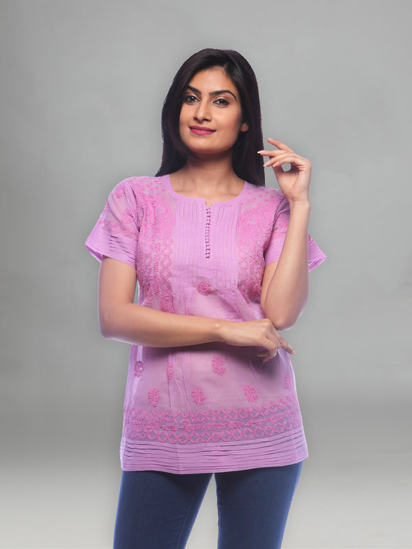 Seva Chikan Hand Embroidered Mauve Cotton Lucknowi Chikankari Short Top-SCL0194
