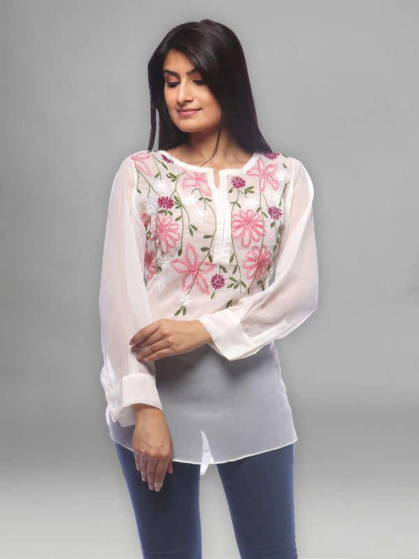 Delineation: Purchase this elegant and comfortable Off White Chikan Short Top online from Seva, is ideal for any fashionista. It has White,Red,Green & Pink-colored rich and attractive chikan embroidery. Buy this classic short top for any occasion, any festival and any party celebrations.