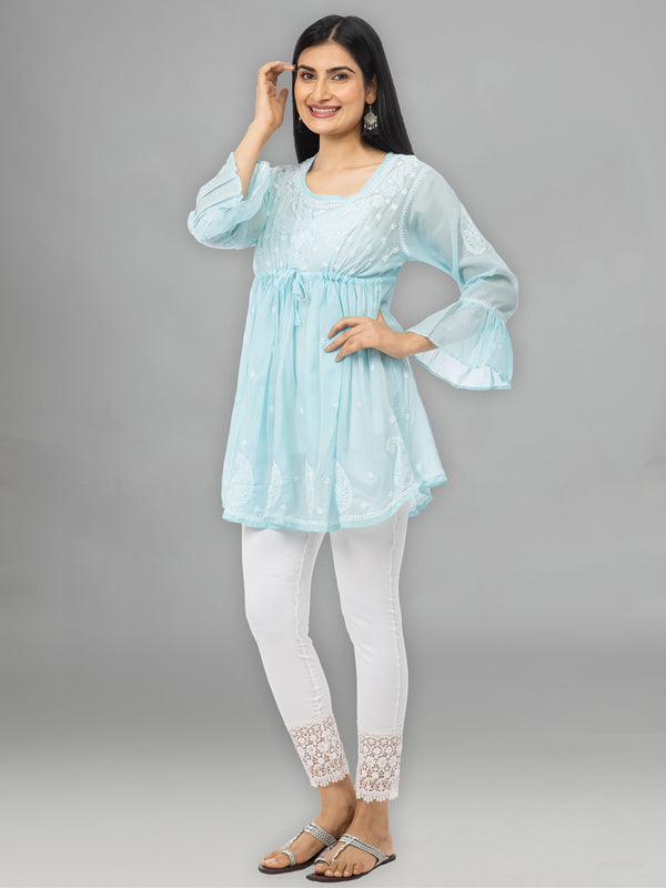 Delineation: Purchase this elegant and comfortable sky blue chikan top online from Seva, is ideal for any fashionista. It has white-coloured rich and attractive chikan embroidery. Buy this classic kurti for any occasion, any festival and any party celebrations.