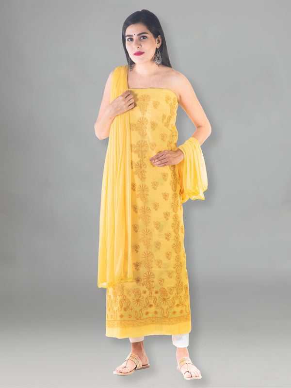 Seva Chikan Hand Embroidered Golden Yellow Cotton Lucknowi Chikan Unstitched Suit Piece-SCL1495
