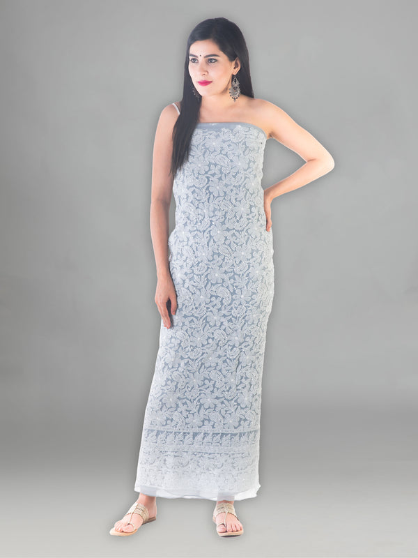 Seva Chikan Hand Embroidered Grey Georgette Lucknowi Chikan Unstitched Suit Piece-SCL1454