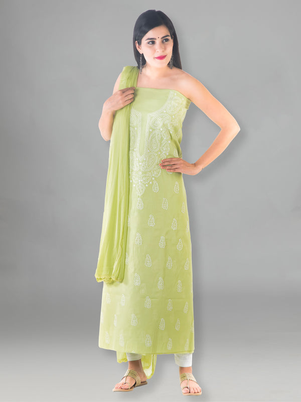 Seva Chikan Hand Embroidered Light Green Cotton Lucknowi Chikan Unstitched Suit Piece-SCL1487
