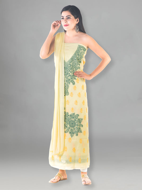Seva Chikan Hand Embroidered Light Yellow Cotton Lucknowi Chikan Unstitched Suit Piece-SCL1493