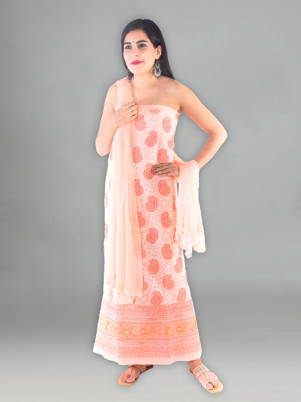 Seva Chikan Hand Embroidered Peach Cotton Lucknowi Chikan Unstitched Suit Piece-SCL1442