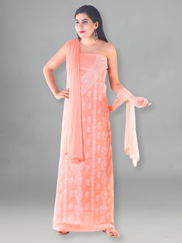 Seva Chikan Hand Embroidered Peach Cotton Lucknowi Chikan Unstitched Suit Piece-SCL1492