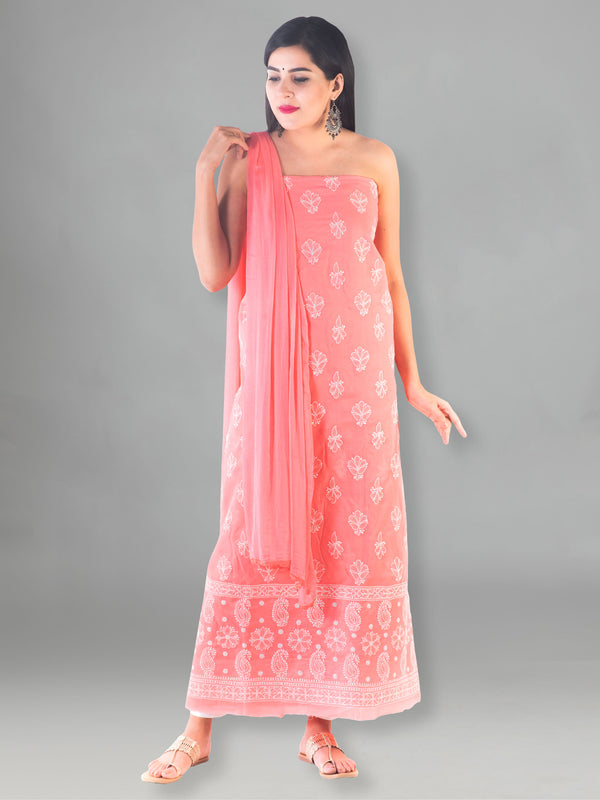 Seva Chikan Hand Embroidered Peach Cotton Lucknowi Chikan Unstitched Suit Piece-SCL1481