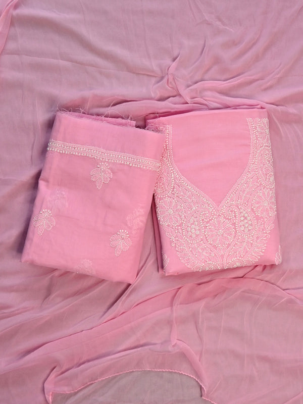 Seva Chikan Hand Embroidered Pink Terivoil Cotton Lucknowi Chikankari Unstitched Suit Piece-SCL13042
