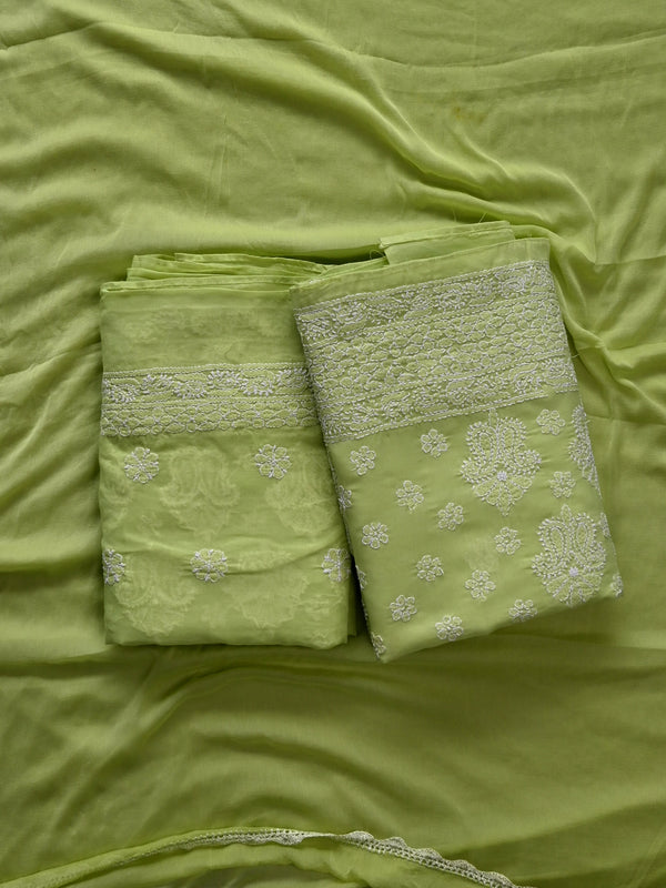 Seva Chikan Hand Embroidered Pista Green Cotton Lucknowi Chikankari Unstitched Suit Piece-SCL13097