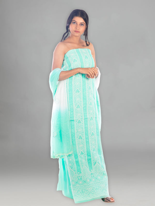 Seva Chikan Hand Embroidered Sea Green Cotton Lucknowi Chikan Unstitched Suit Piece-SCL1158