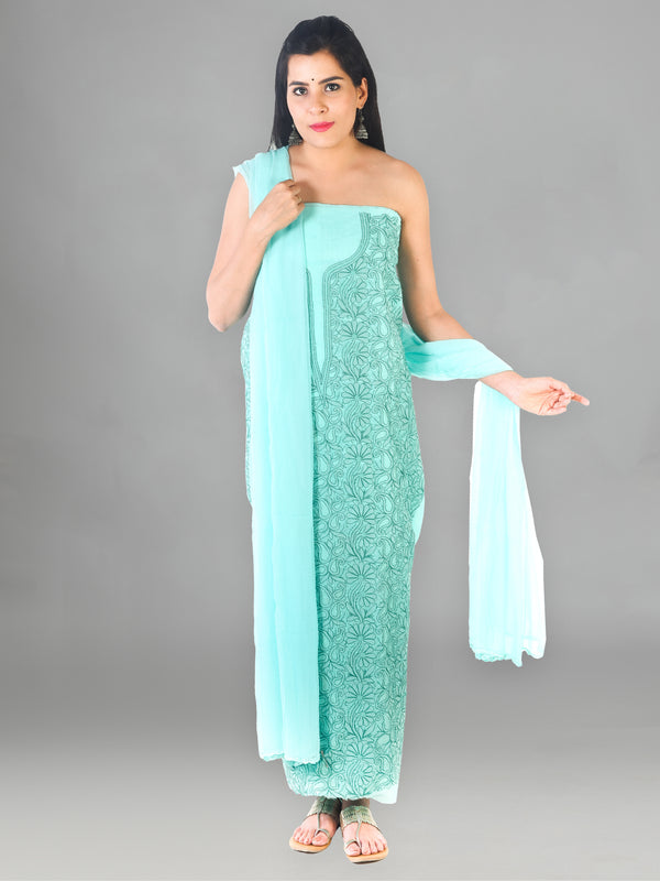 Seva Chikan Hand Embroidered Sea Green Cotton Lucknowi Chikankari Unstitched Suit Piece-SCL1688