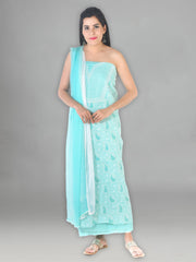 Seva Chikan Hand Embroidered Turquoise Cotton Lucknowi Chikan Unstitched Suit Piece-SCL1413
