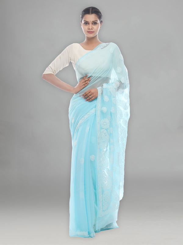 Seva Chikan Hand Embroidered Blue Georgette Lucknowi Saree-SCL2340