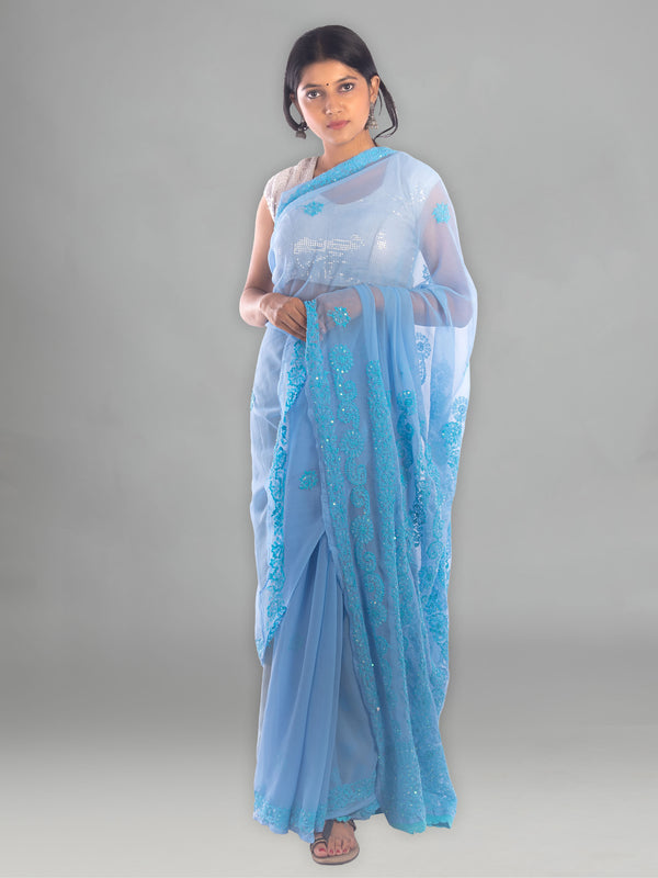 Seva Chikan Hand Embroidered Blue Georgette Lucknowi Saree With Sequins Work-SCL1757
