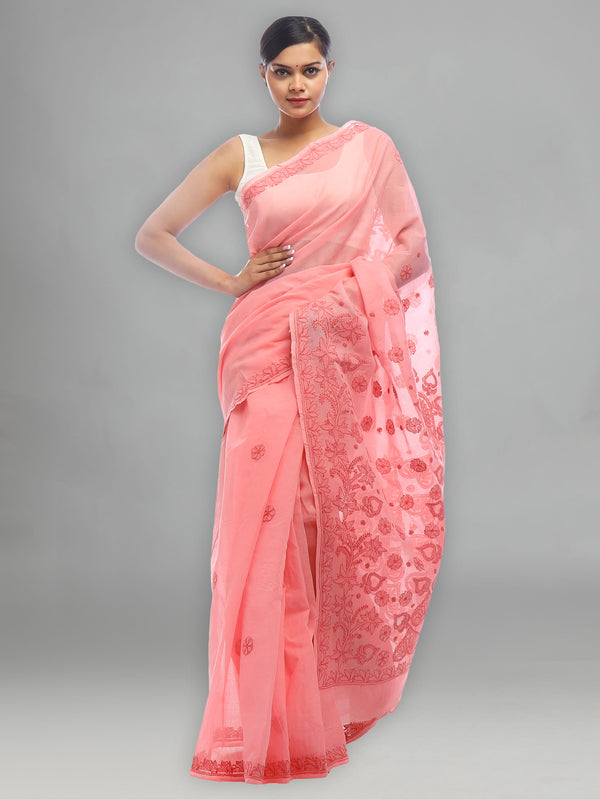 Seva Chikan Hand Embroidered Carrot Pink Cotton Lucknowi Saree-SCL2476