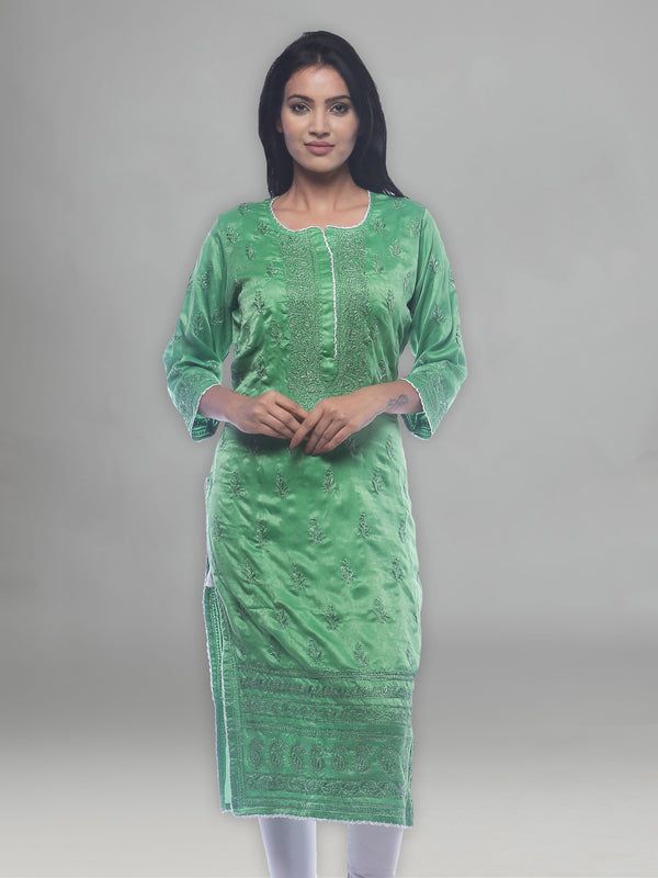 Delineation: Purchase this elegant and comfortable dark green chikan Kurti online from Seva, is ideal for any fashionista. It has white-coloured rich and attractive chikan embroidery. Buy this classic kurti for any occasion, any festival, party celebrations.