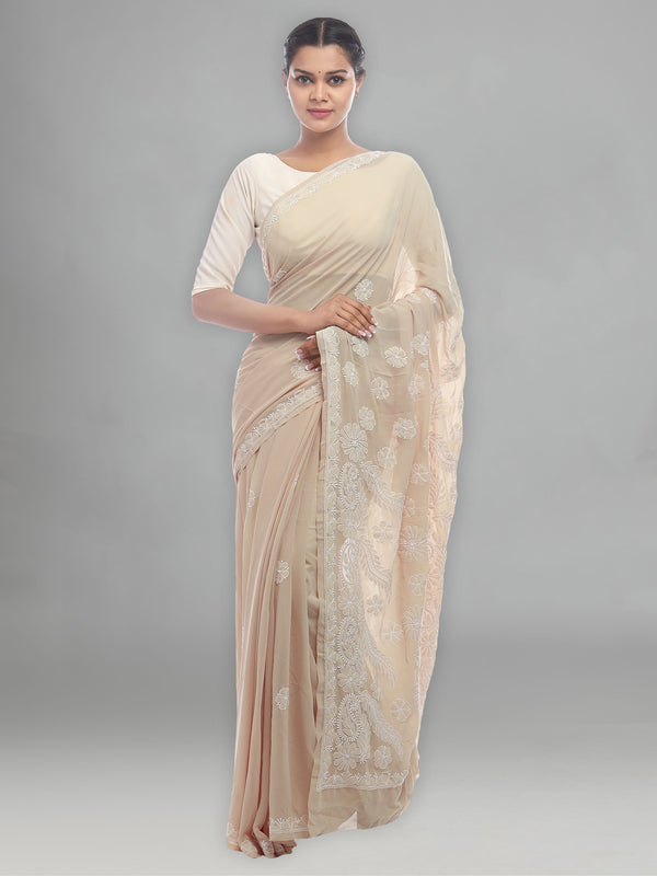 Seva Chikan Hand Embroidered Beige Georgette Lucknowi Chikan Saree-SCL2337