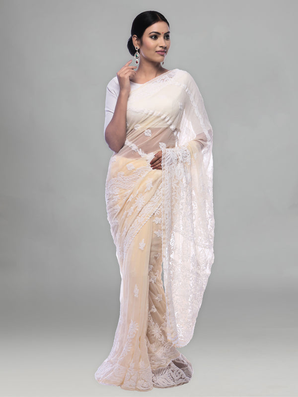 Seva Chikan Hand Embroidered Fawn Georgette Lucknowi Saree-SCL0374