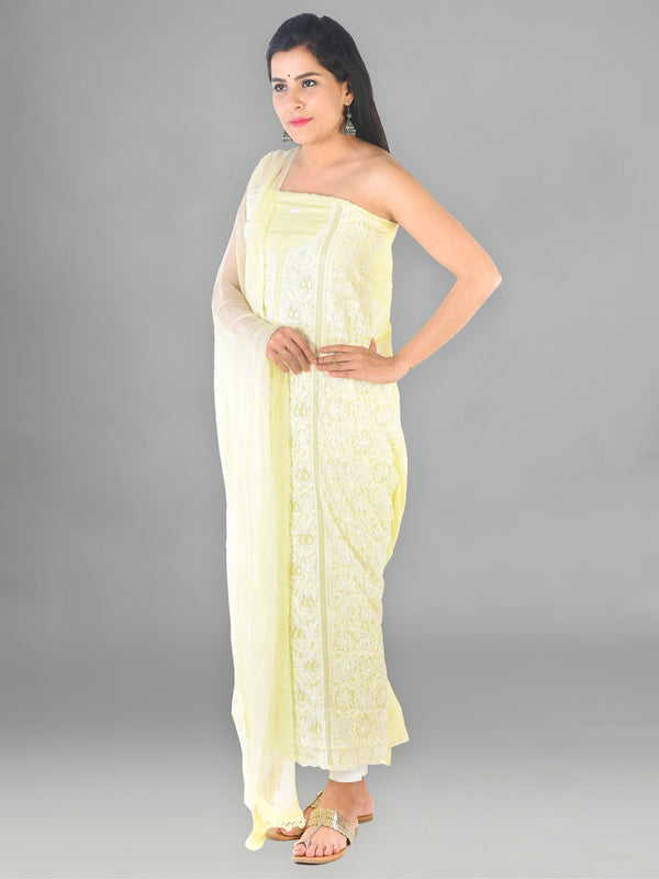 Seva Chikan Hand Embroidered Lemon Cotton Lucknowi Chikankari Unstitched Suit Piece-SCL1653