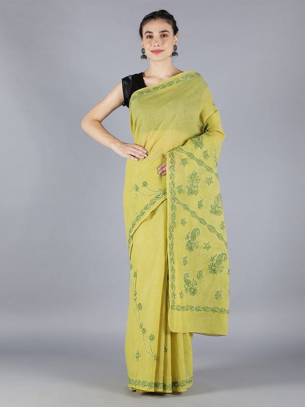 Seva Chikan Hand Embroidered Mehndi Green Cotton Lucknowi Saree-SCL6000