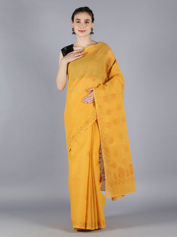 Seva Chikan Hand Embroidered Mustard Cotton Lucknowi Saree-SCL6012