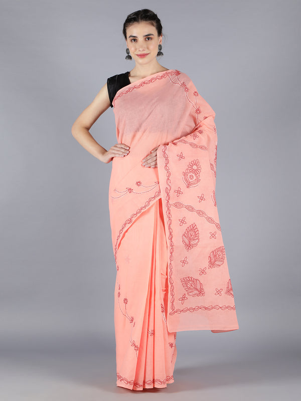 Delineation: Purchase this elegant and comfortable peach chikan saree online from Seva, is ideal for any fashionista. It has peach-coloured rich and attractive chikan embroidery. Buy this classic saree for any occasion, any puja and festival, any party celebrations.