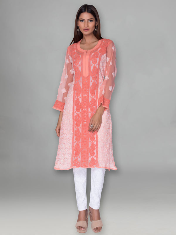 Seva Chikan Hand Embroidered Peach Faux Georgette Lucknowi Chikankari Kurta-SCL0963