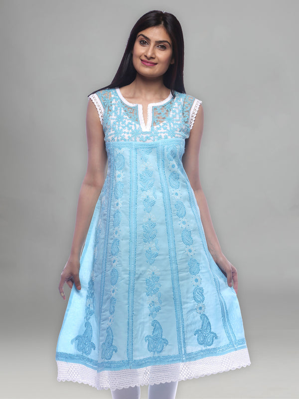 Seva Chikan Hand Embroidered Sky Blue Cotton Lucknowi Chikankari Anarkali-SCL0241