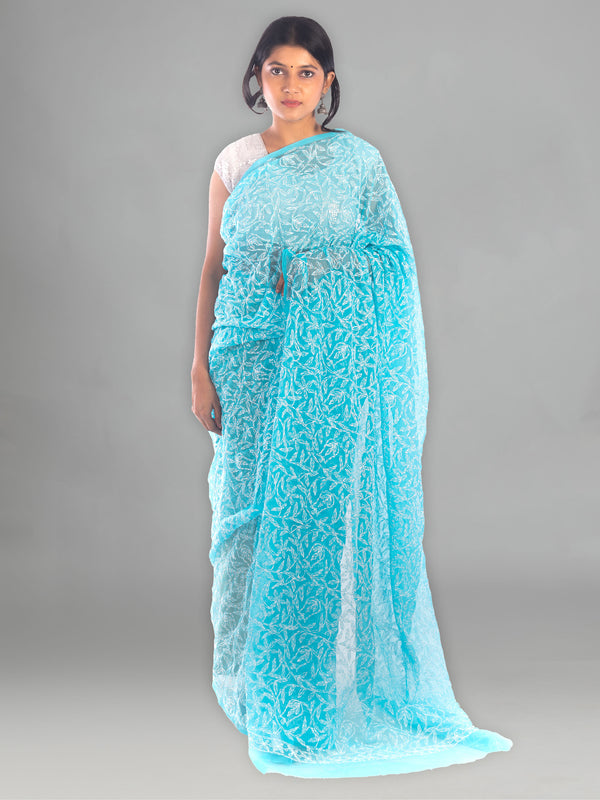 Seva Chikan Hand Embroidered Sky Blue Georgette Lucknowi Saree-SCL1758