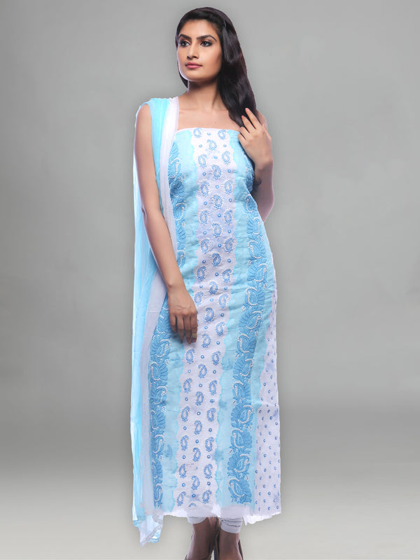 Seva Chikan Hand Embroidered White/Blue Cotton Lucknowi Chikankari Unstitched Suit Piece -SCL0015