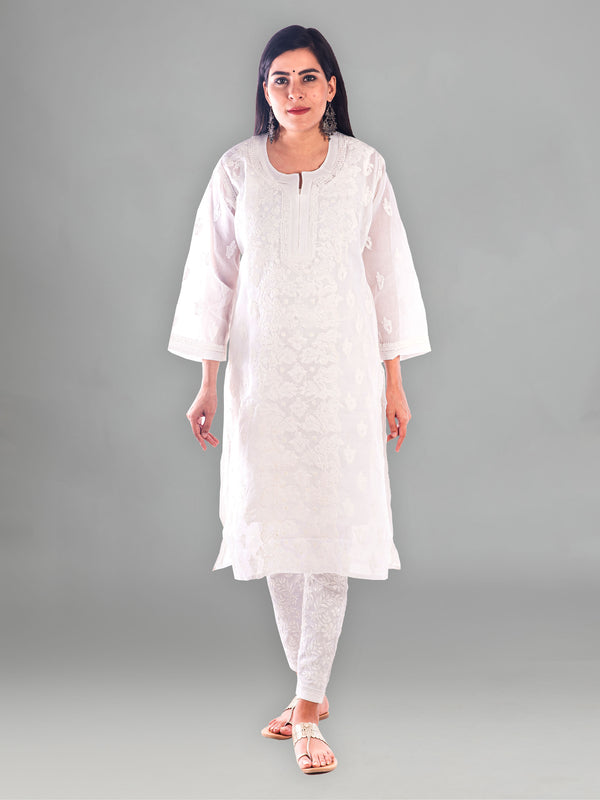 Seva Chikan Hand Embroidered White Cotton Lucknowi Chikan Kurta-SCL0945