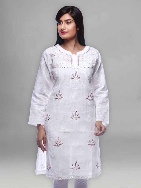 Seva Chikan Hand Embroidered White Cotton Lucknowi Chikan Kurti-SCL0225