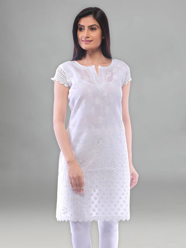 Seva Chikan Hand Embroidered White Cotton Lucknowi Chikan Kurti With Sequin Work-SCL0312