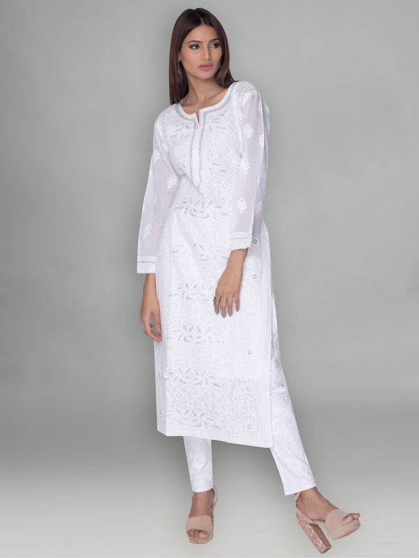 Seva Chikan Hand Embroidered White Cotton Lucknowi Chikankari Kurta With Muqaish Work-SCL0993