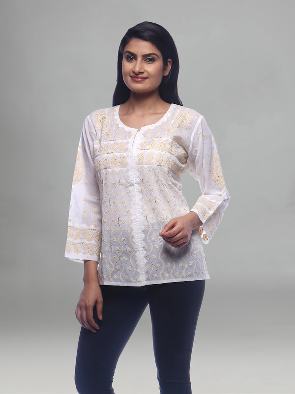 Delineation: Purchase this elegant and comfortable White Chikan Top online from Seva, is ideal for any fashionista. It has Beige-colored rich and attractive chikan embroidery. Buy this classic short top for any occasion, any festival and any party celebrations.