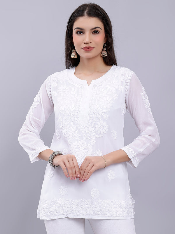Seva Chikan Hand Embroidered White Crepe Lucknowi Chikankari Top With Inner SCL9107