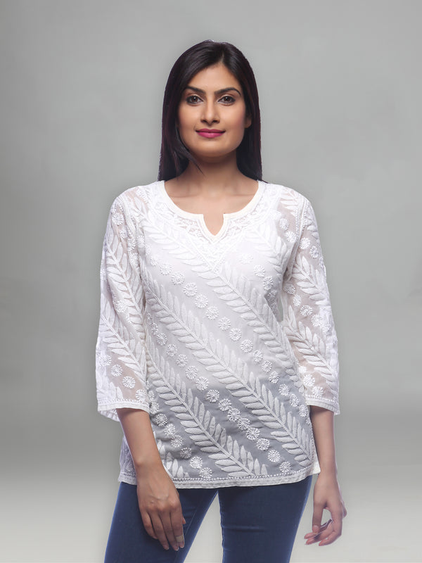 Seva Chikan Hand Embroidered White Georgette Lucknowi Chikankari Short Top-SCL0523