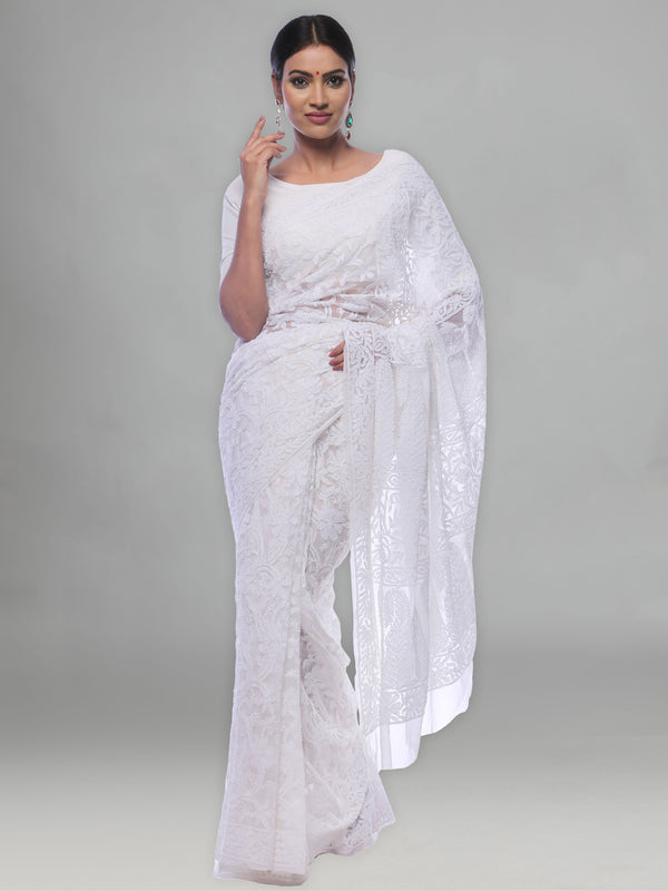 Seva Chikan Hand Embroidered White Georgette Lucknowi Saree1-SCL0410