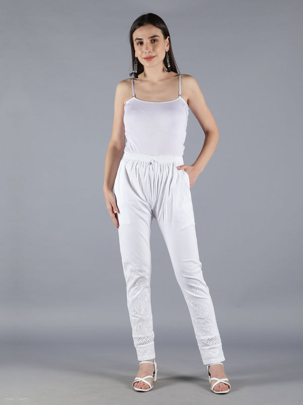 Seva Chikan Hand Embroidered White Lycra Lucknawi Chikankari Pant-SCL11018