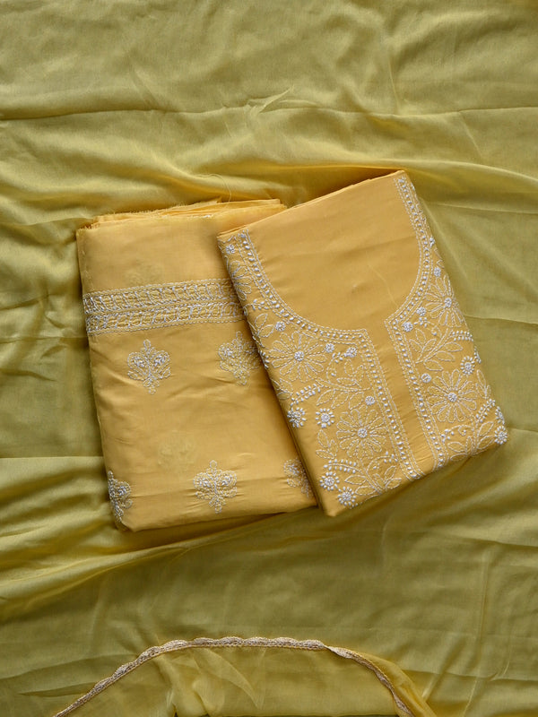 Seva Chikan Hand Embroidered Yellow Cotton Lucknowi Chikankari Unstitched Suit Piece-SCL13071