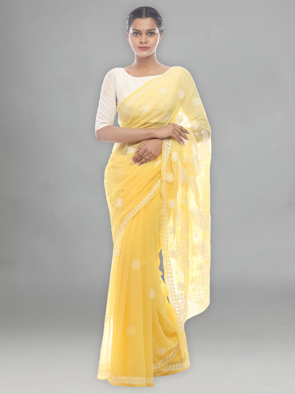 Seva Chikan Hand Embroidered Yellow Georgette Lucknowi Saree-SCL2460