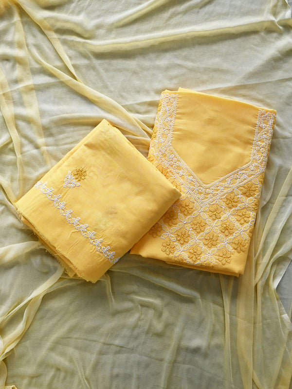 Seva Chikan Hand Embroidered Yellow Terivoil Cotton Lucknowi Chikankari Unstitched Suit Piece-SCL13016